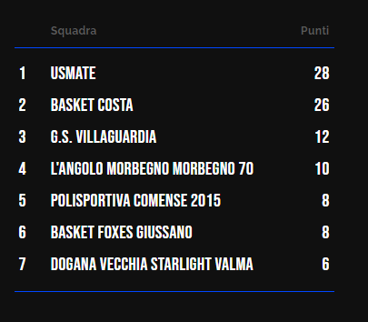 76 | 46 | lun 24 nov 2025 | 21.00 | Basket Usmate | ASM70 L'Angolo | gio 05 feb 2026 | 21.00 | 73 | 39 | |